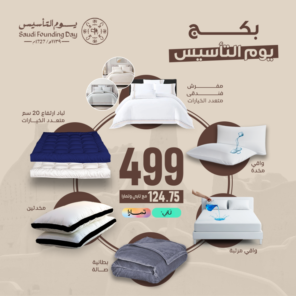 استعد لاستقبال يوم التاسيس براحة مضاعفة ورفاهية فاخرة مع بكج يوم التاسيس الذي يجمع أهم مستلزمات السرير في حزمة واحدة متناسقة. تم اختيار كل قطعة بعناية لتوفير نوم هادئ، حماية عالية، ومظهر فندقي أنيق لسريرك.