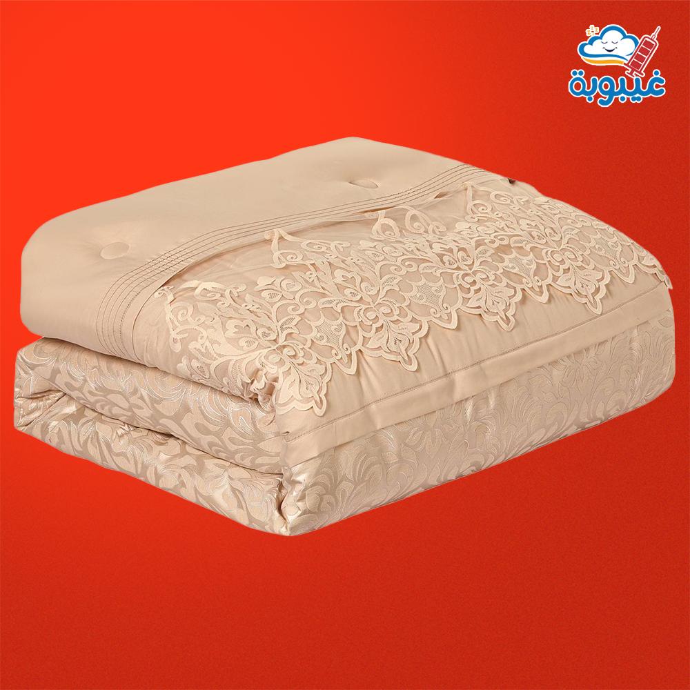 • 1 × لحاف نفرين فاخر – مقاس 240×260 سم، بخامة شانيل حريري بنعومة استثنائية ولمسات دانتيل راقية.