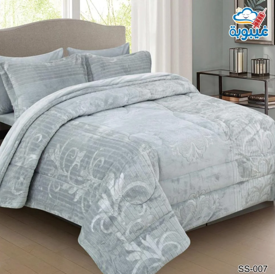 طقم مفرش شتوي وجهين 007 طقم كامل متكامل من 6 قطع يضفي على غرفتك طابعاً شتوياً فاخراً ويضمن لك تجربة نوم مريحة كأنها عناق دافئ طوال الليل من مخمل ناعم بنقوش محفورة تزيد من فخامة الشكل وجودة الملمس بسعر 455 ريال سعودي.